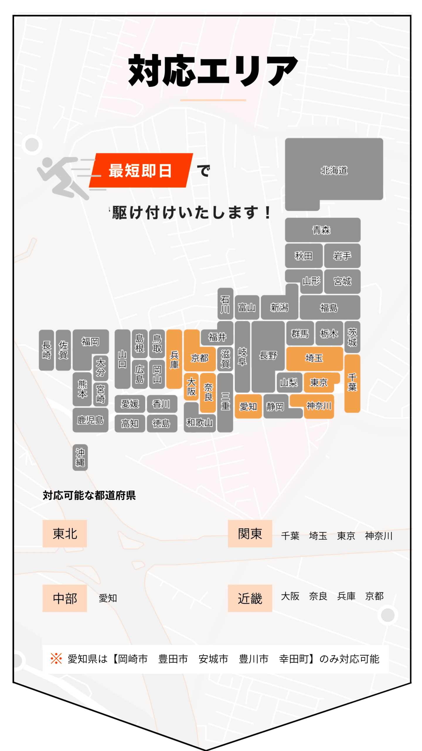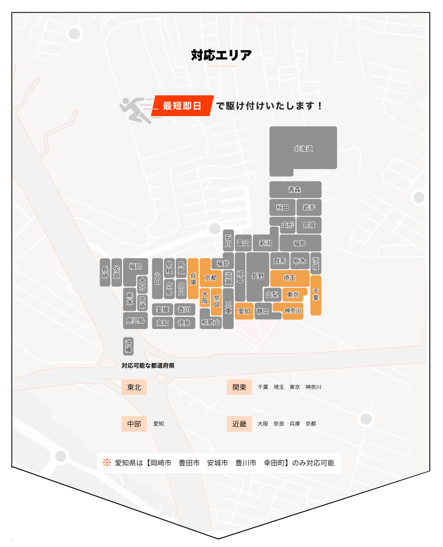 A.対応エリアの周辺地域であれば可能な場合もございます。また対応エリアから大幅に離れていても、追加料金でご対応が可能な場合もございます。まずはお気軽にお問い合わせください。